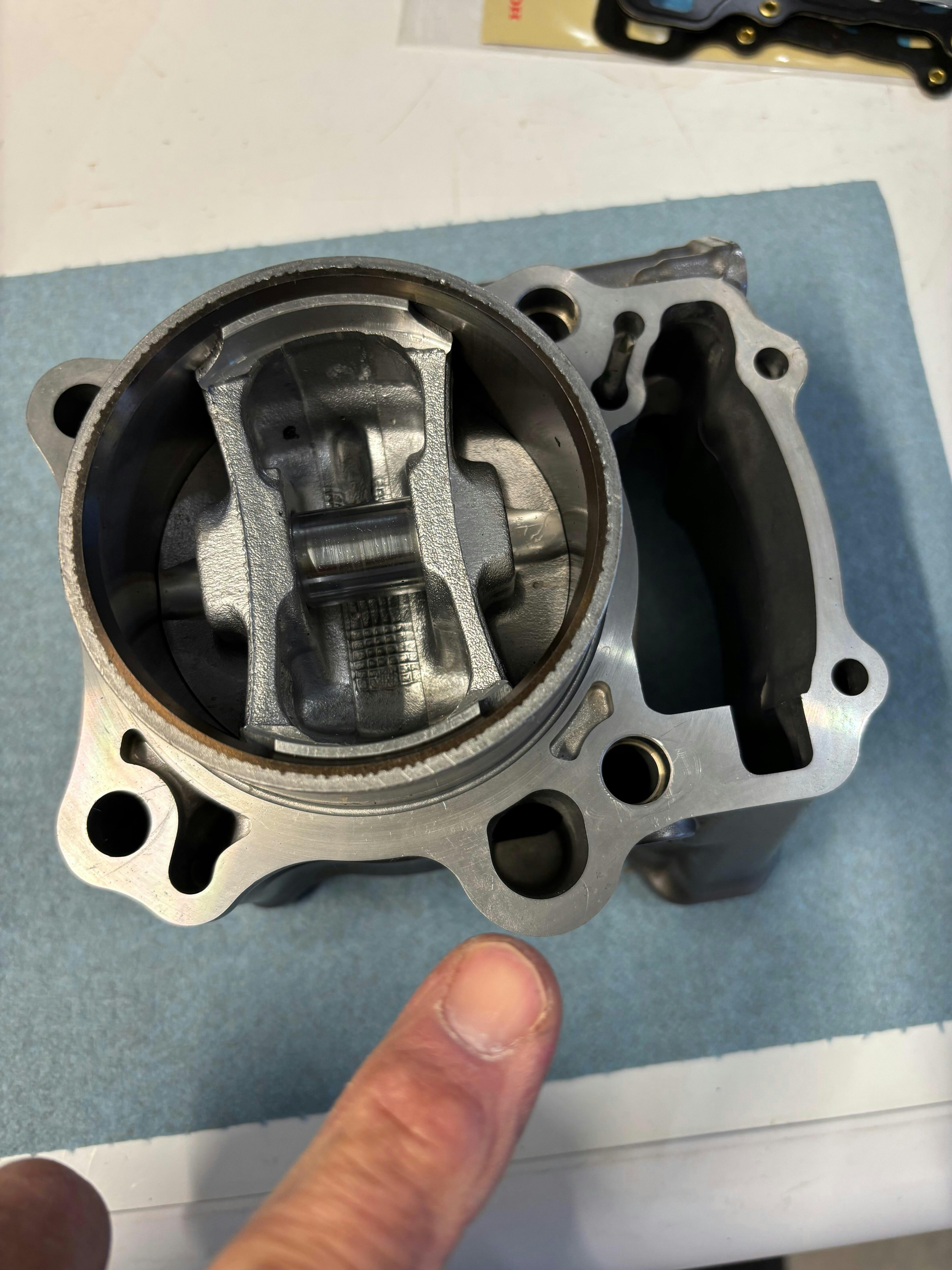 To ease installation, we now pre-set ring gap, install and orient the rings on the piston, install the right (cam-chain side) wrist-pin circlip, lubricate the piston and cylinder, and then slot the piston into the cylinder. This greatly reduces the work required for installation; just drop the whole assembly onto the con-rod, install the left circlip, and press the cylinder down.